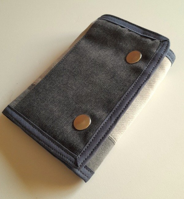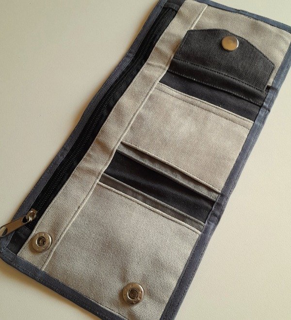 Realizada con pana de tapicería y forrada. Bolsillo grande para billetes, bolsillo con broche para monedas y cuatro divisiones para tarjetas.
