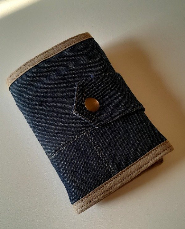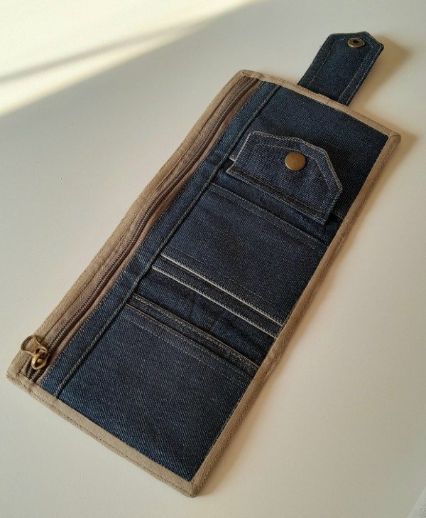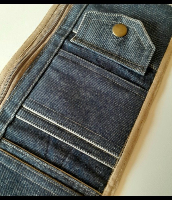 Realizada con retazos de jean grueso y forrada. Bolsillo grande para billetes, bolsillo con broche para monedas y cuatro divisiones para tarjetas.