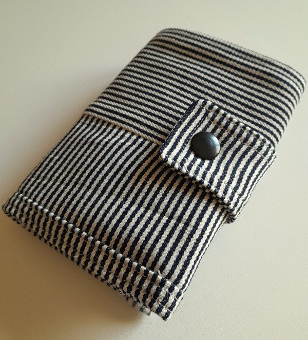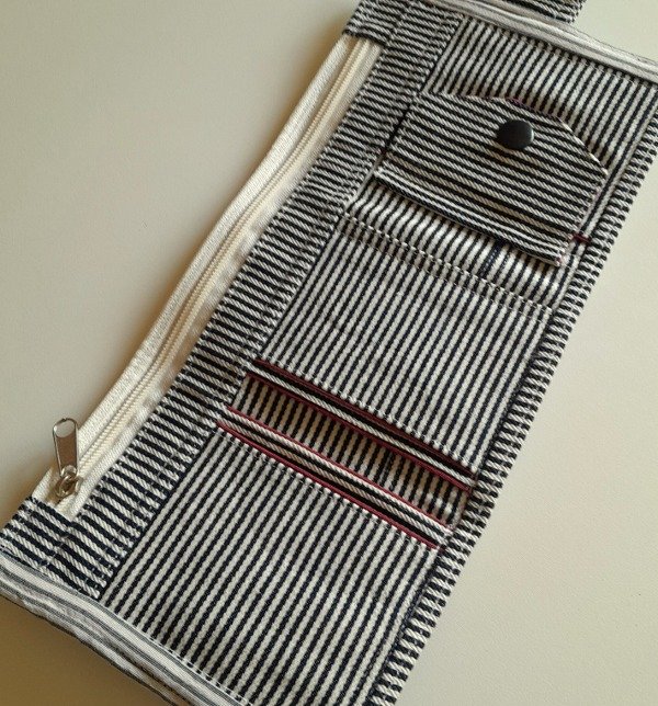 Realizada con jean grueso rayado de algodón y forrada. Bolsillo grande para billetes, bolsillo con broche para monedas y cuatro divisiones para tarjetas.