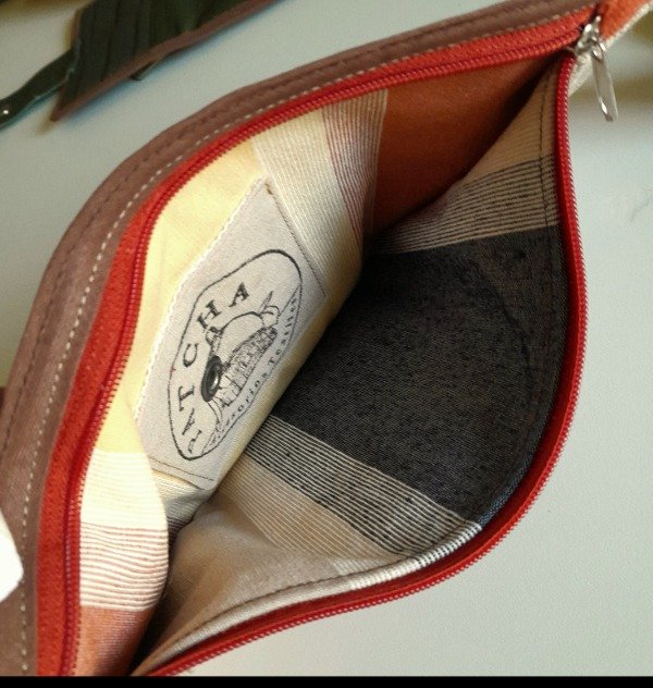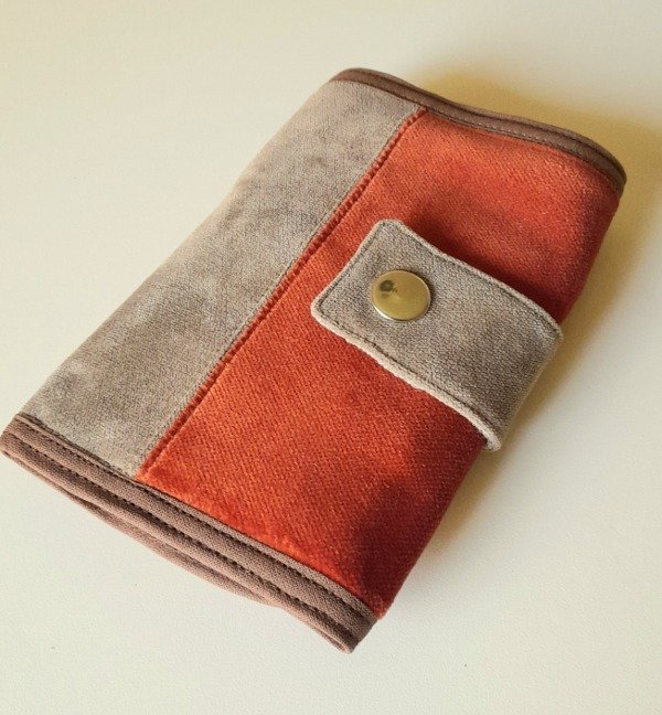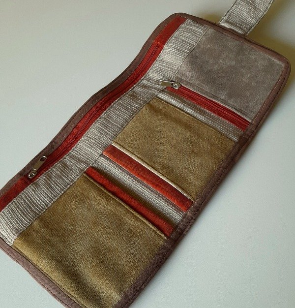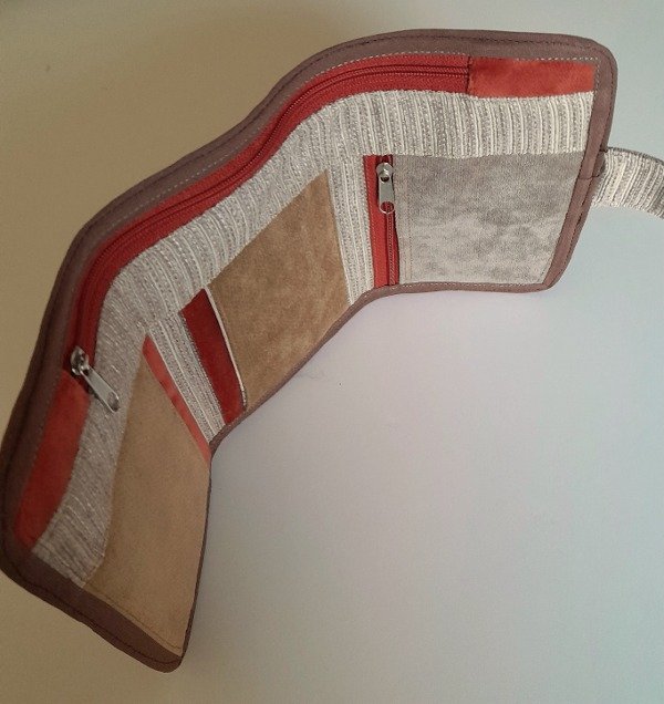Realizada con pana y terciopelo de tapicería y forrada. Bolsillo grande para billetes, bolsillo con cierre para monedas y cuatro divisiones para tarjetas.