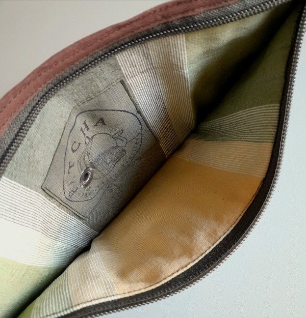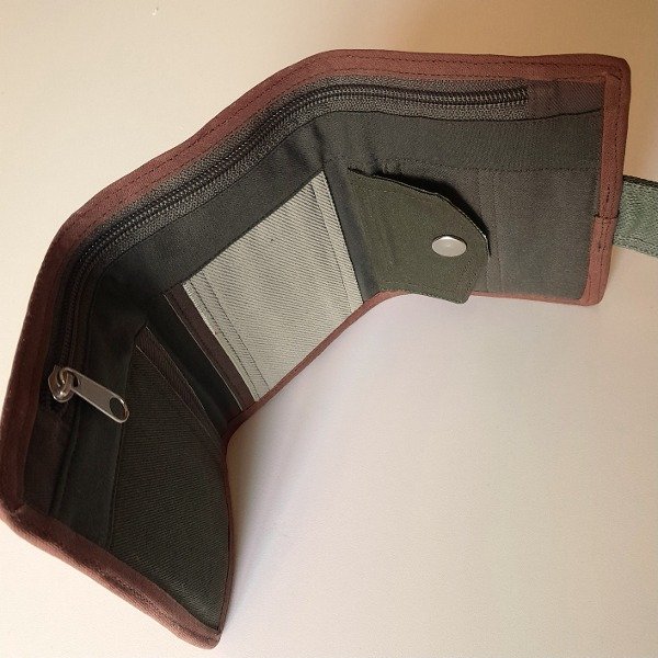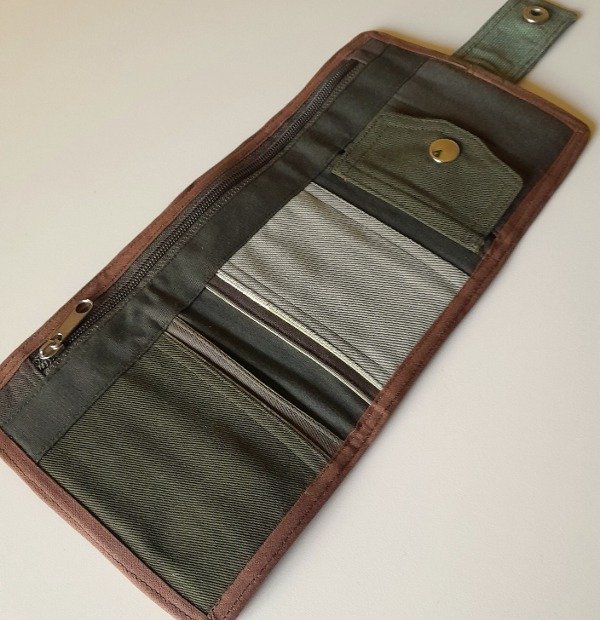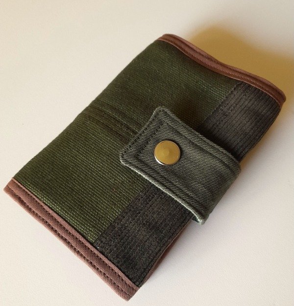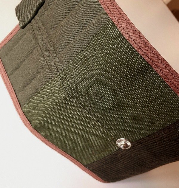 Realizada con pana gabardina, panamá y corderoy, matelaseada y forrada. Bolsillo grande para billetes, bolsillo con broche para monedas y cuatro divisiones para tarjetas.