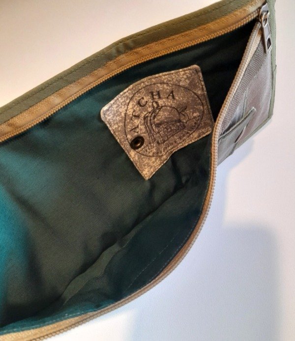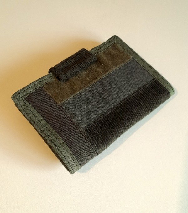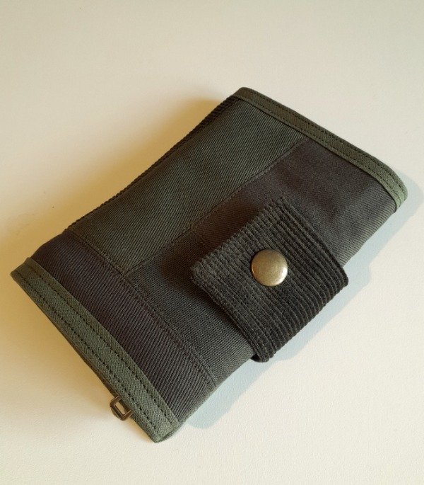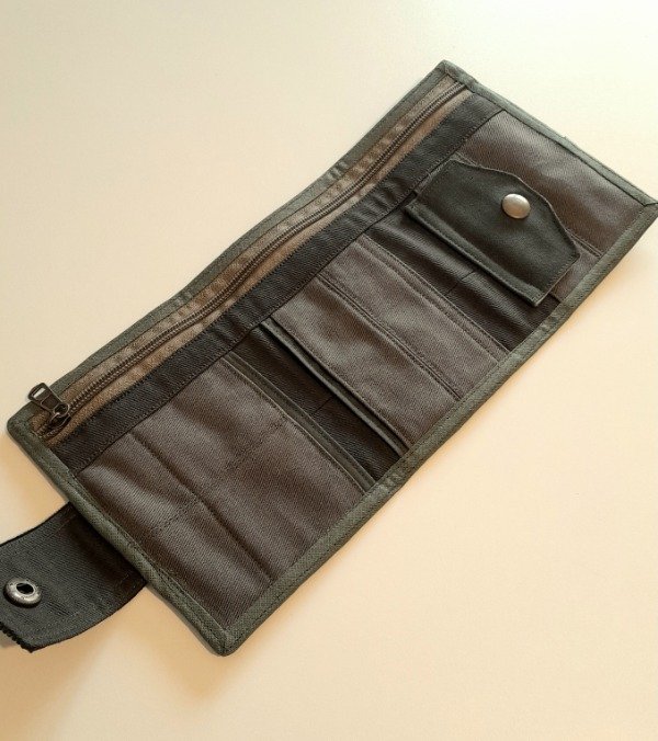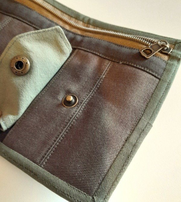 Realizada con gabardina, panamá y corderoy de algodón y forrada. Bolsillo grande para billetes, bolsillo con broche para monedas y cuatro divisiones para tarjetas.