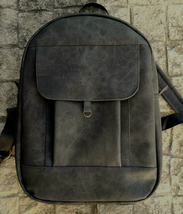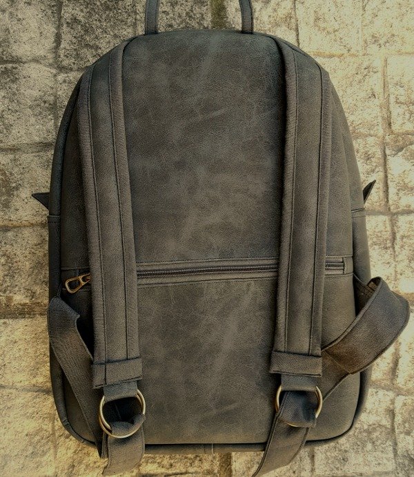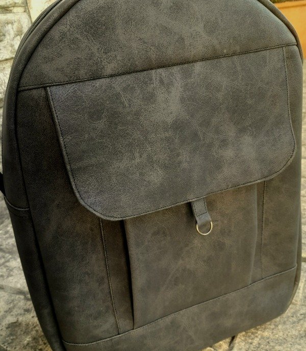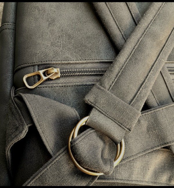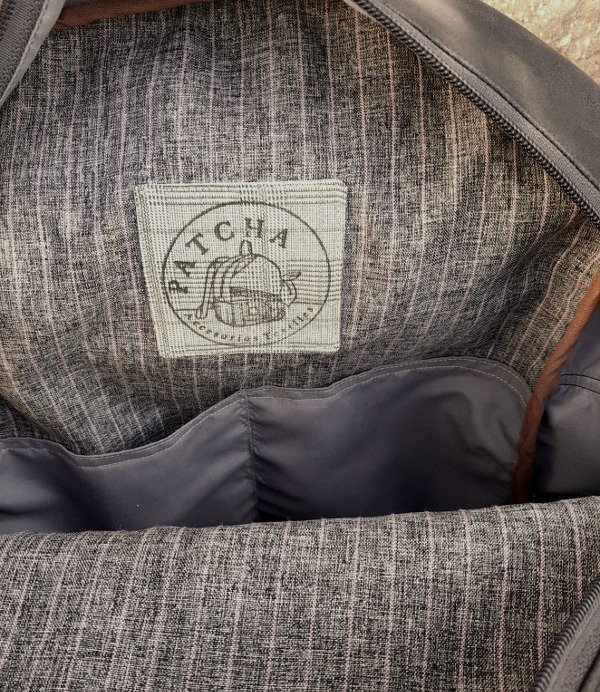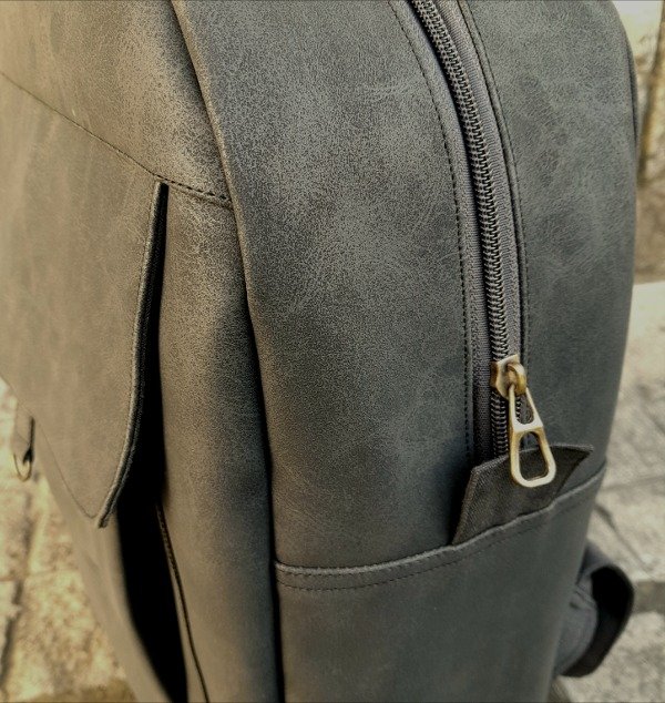 Realizada con cuerina biodegradable. Se puede compostar (antes retirarle cierres y forro). Bolsillo de fuelle con broche yvtapa en el frente, otro grande con cierre en el dorso y dos simples en el forro interior. Tiras acolchadas y ajustables.