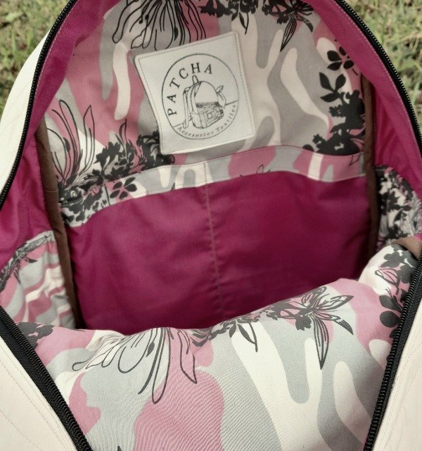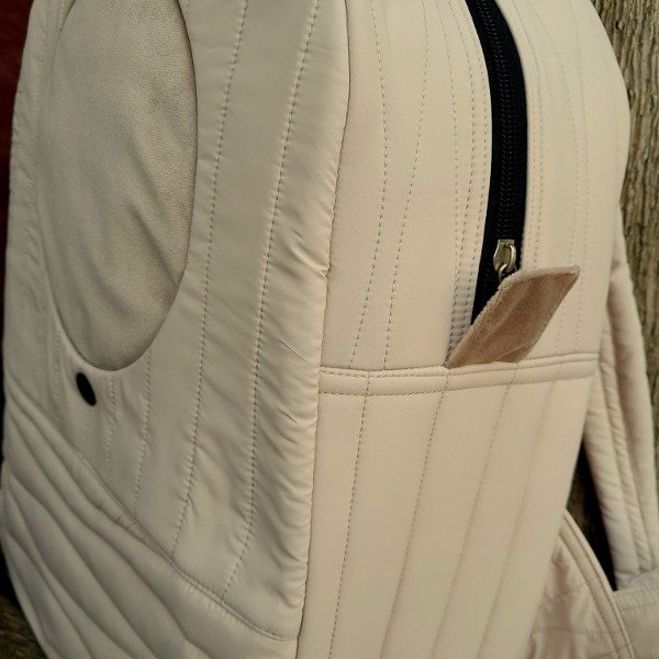 Bolsillo con acceso redondo de terciopelo de algodón acolchado y broche en el frente, en el dorso uno grande con cierre y dos simples en el forro interior. Tiras acolchadas y ajustables.