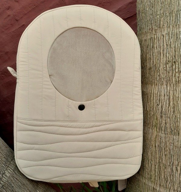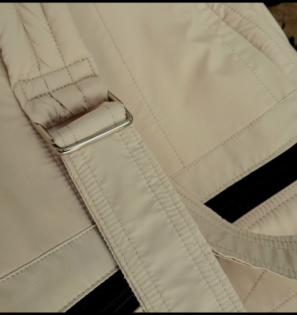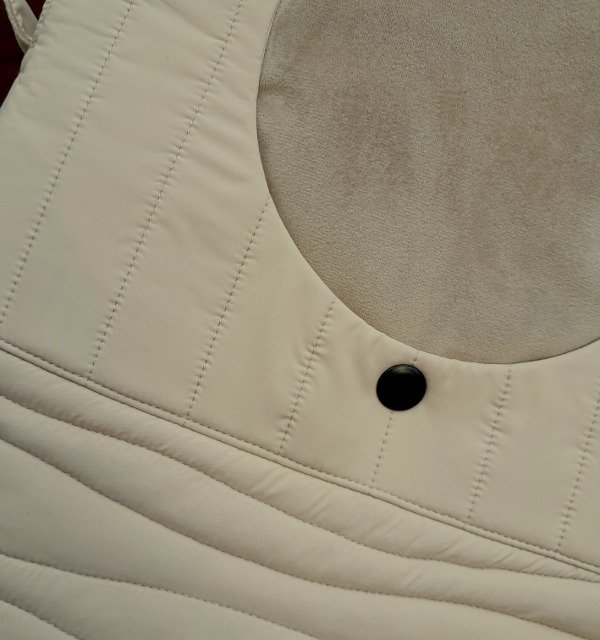 Realizada con tela impermeable color natural, totalmente matelaseada y acolchada (en la base lleva 5 capas de tela: exterior, friza, guata, fliselina y forro. En el resto 3 capas: tela impermeable, paño y forro.