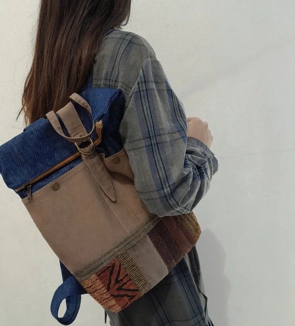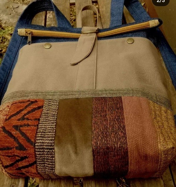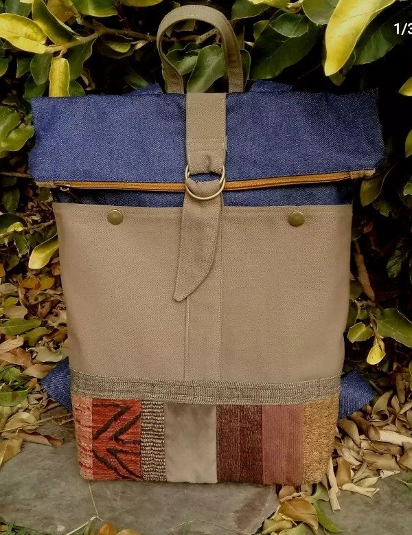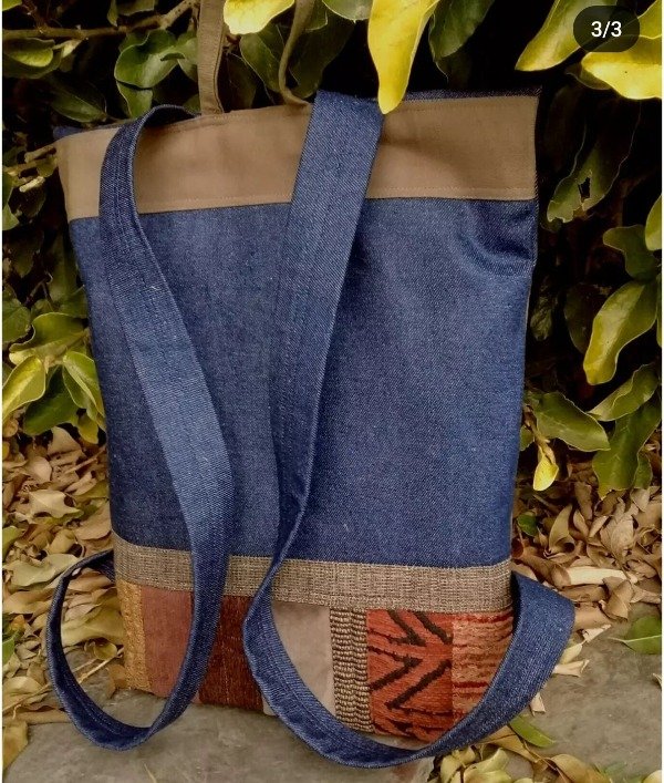 Realizada con jean y gabardina. Base acolchada y matelaseada con telas de tapicería.