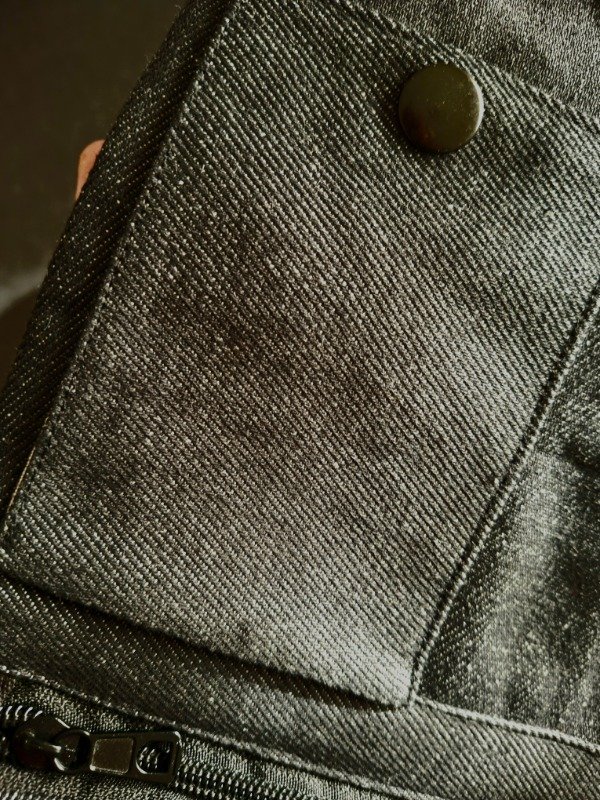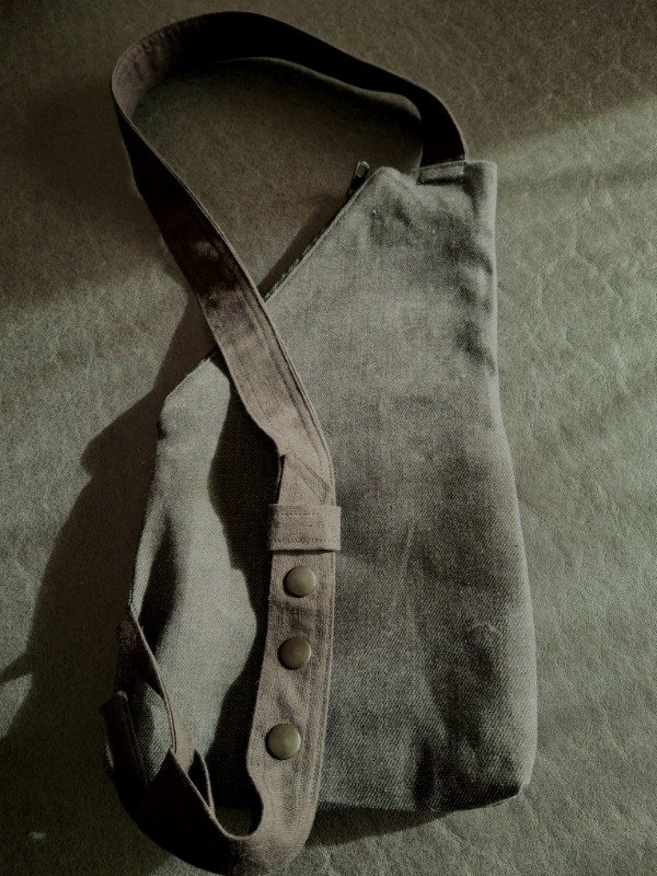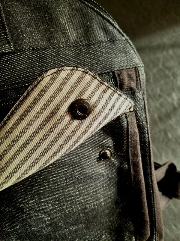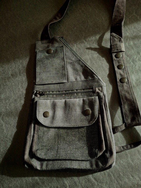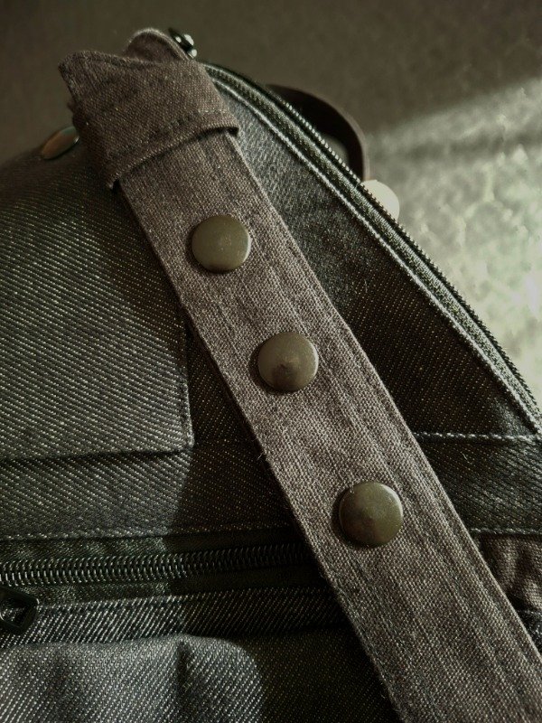 Realizada con jean grueso combinado con gabardina. Dos bolsillos con fuelle, uno cierra con broches y otro con cierre. Bolsillo con broche para tarjeta y acceso al cuerpo principal con cierre. Tira ajustable. Tanto bolsillos como cuerpo forrados.